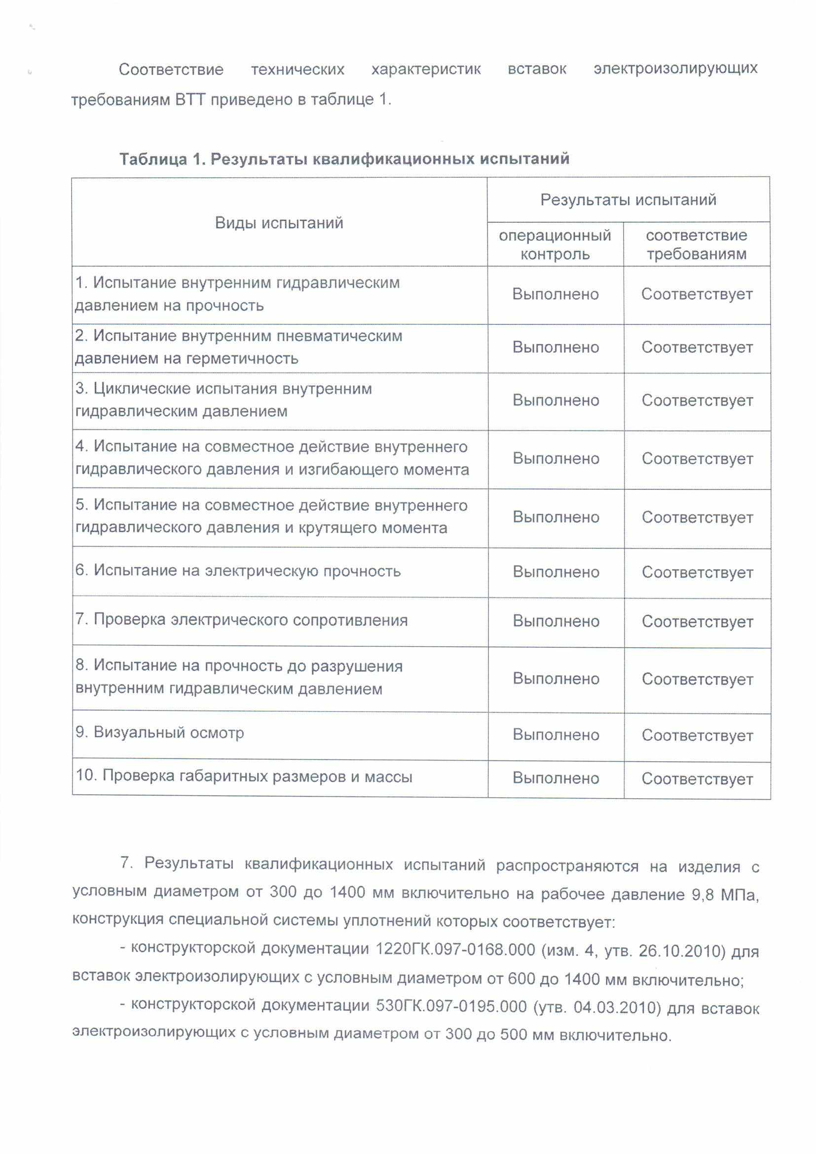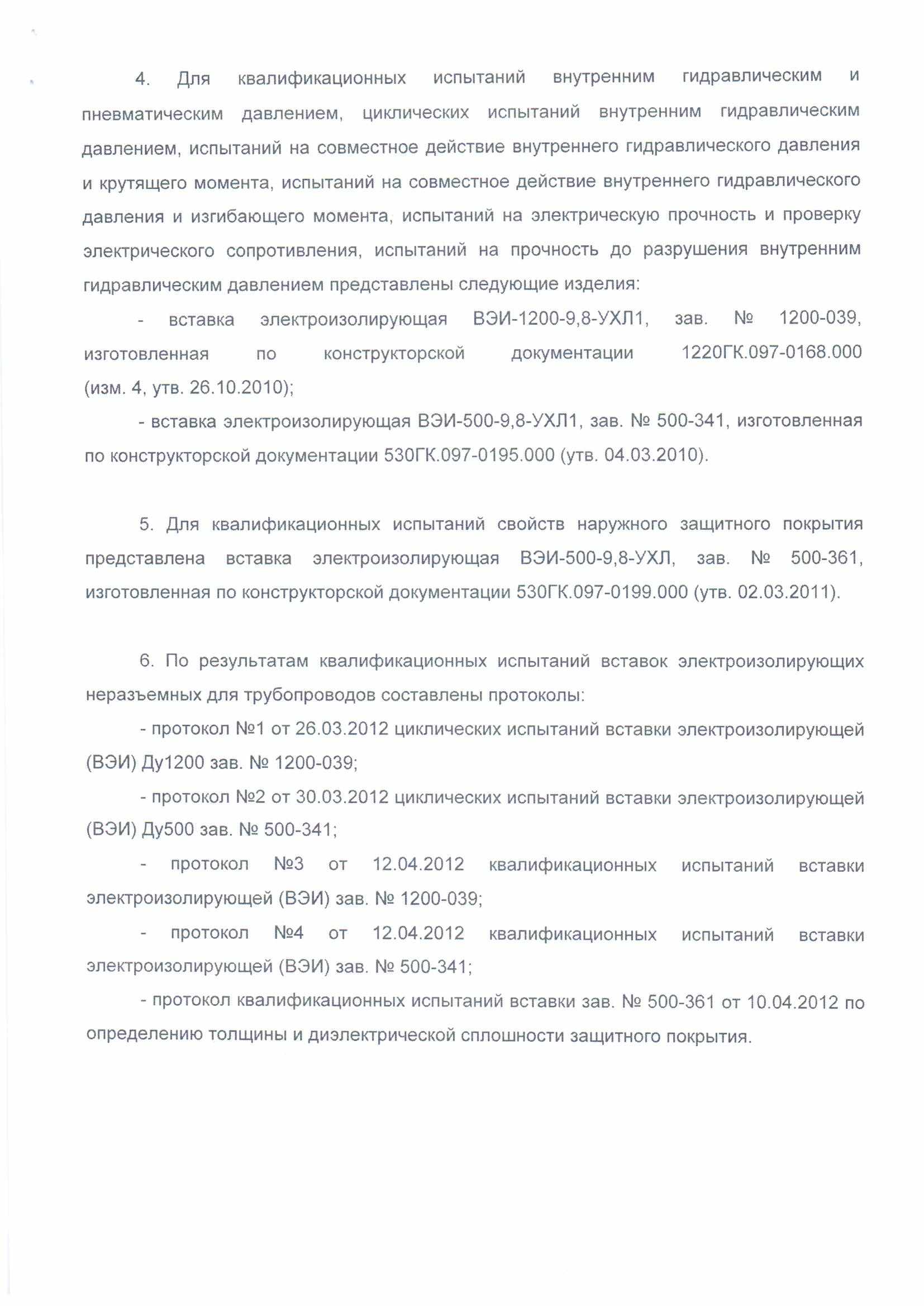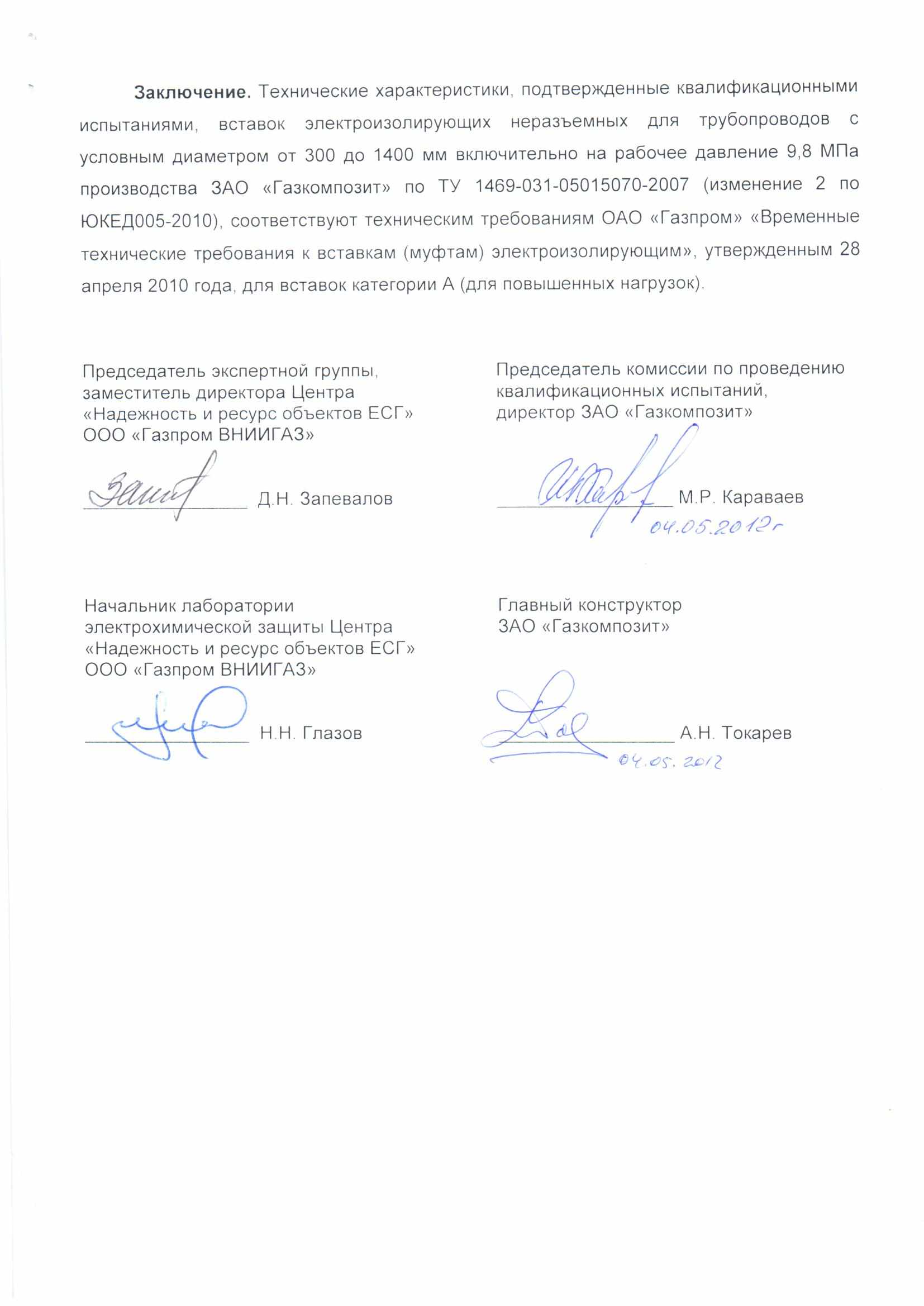 Проведение квалификационных испытаний вставок электроизолирующих ТУ 1469-031-05015070-2007 категории А Ду500мм Ру9,8МПа, Ду 1200мм Ру9,8МПа производства ЗАО "Газкомпозит" на соответствие "Временным техническим требованиям к вставкам (муфтам) электроизолирующим" ОАО Газпром комиссией в составе представителей головных экспертных организаций ООО "Газпром ВНИИГАЗ", ОАО "Оргэнергогаз", ЗАО "Газкомпозит", подтвердившие соответствие установленным требованиям ОАО "Газпром".